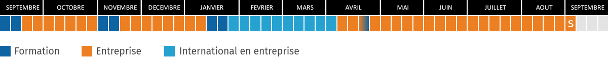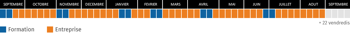 Rythme d’alternance : 2 semaines de formation + 1 jour semaine pour 6 à 8 semaines en entreprise pendant 3 semestres, puis 6 mois totalement en entreprise